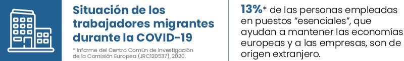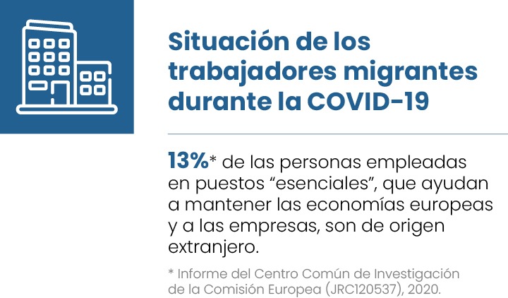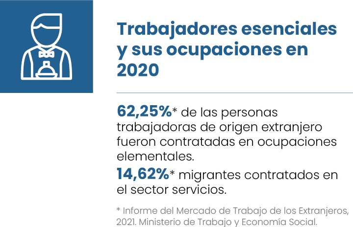 La población inmigrante está altamente representada en este tipo de ocupaciones menos consideradas socialmente y, en muchas ocasiones, precarias. Además, ha sufrido de forma más directa los efectos de la COVID-19, debido a factores como la mayor exposición de los sectores en los que mayoritariamente trabajan, su mayor presencia en la economía informal, el mayor peso de los contratos temporales o su menor antigüedad laboral.